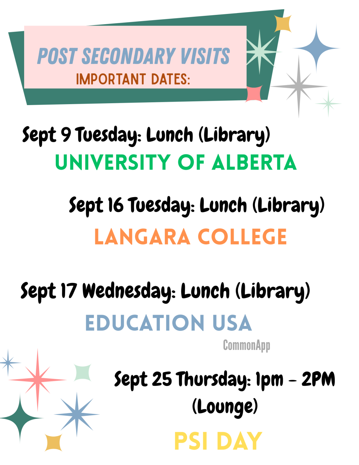 Applying to a Post Secondary institution requires several important steps you need to follow. Before you begin your first application, you will need to visit https://www.educationplannerbc.ca/ and create an account. From this site, you will be able to choose your Post Secondary schools; it is recommended to apply to more than ONE school (at least 3 ) to ensure you get into one school. If you're unsure how many schools to apply for, please contact me.   It is always a good idea to apply to a public college (Langara College, KPU, Douglas to name a few) as a back up. Once you've created your personal account on the educationplannerbc website, you will be able to begin your application to your selected PSIs (Post Secondary Institutions). If you scroll further down from this page, you'll see that I've also attached a guide on those important steps to your Post secondary application.